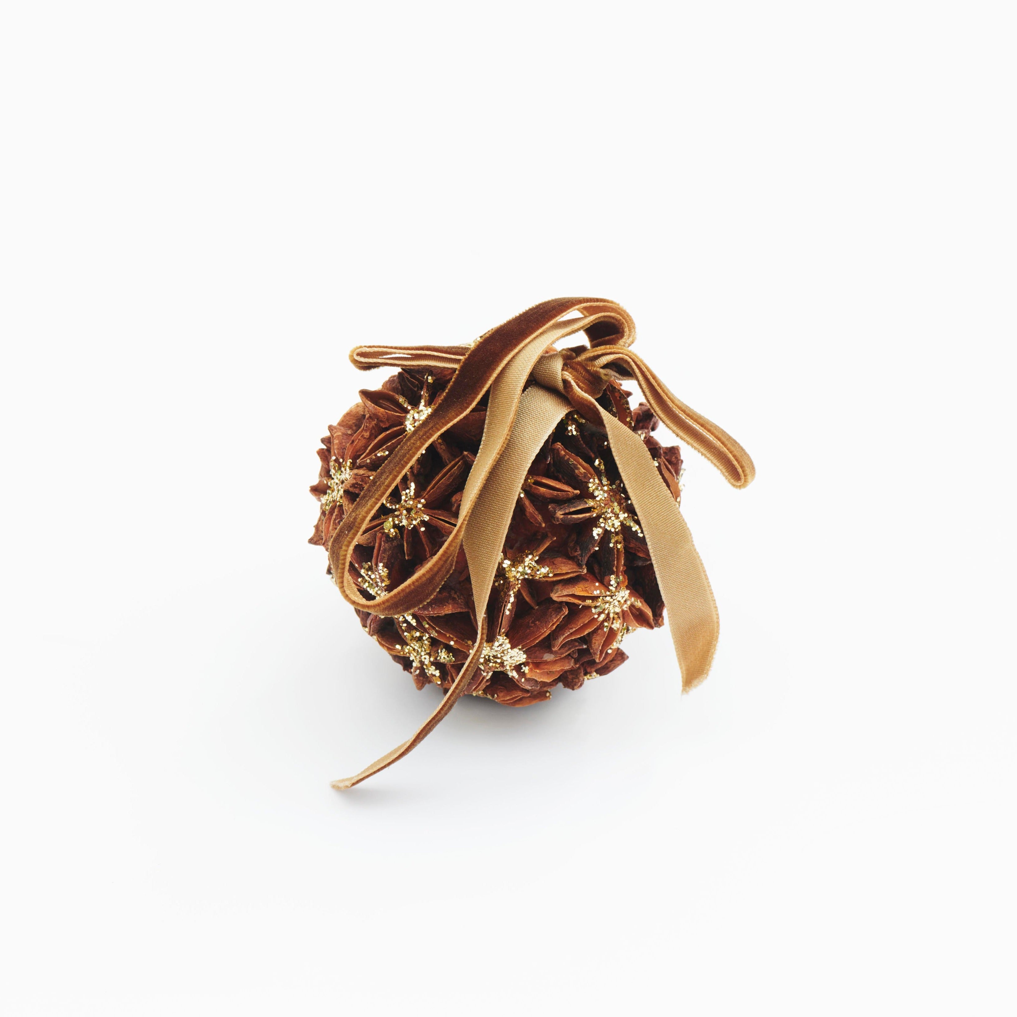 Made from real star anise pods, this beautifully fragrant bauble brings a warm, spicy scent and rustic charm to your festive decorations. Finished with a soft velvet ribbon and a touch of glitter for subtle sparkle.