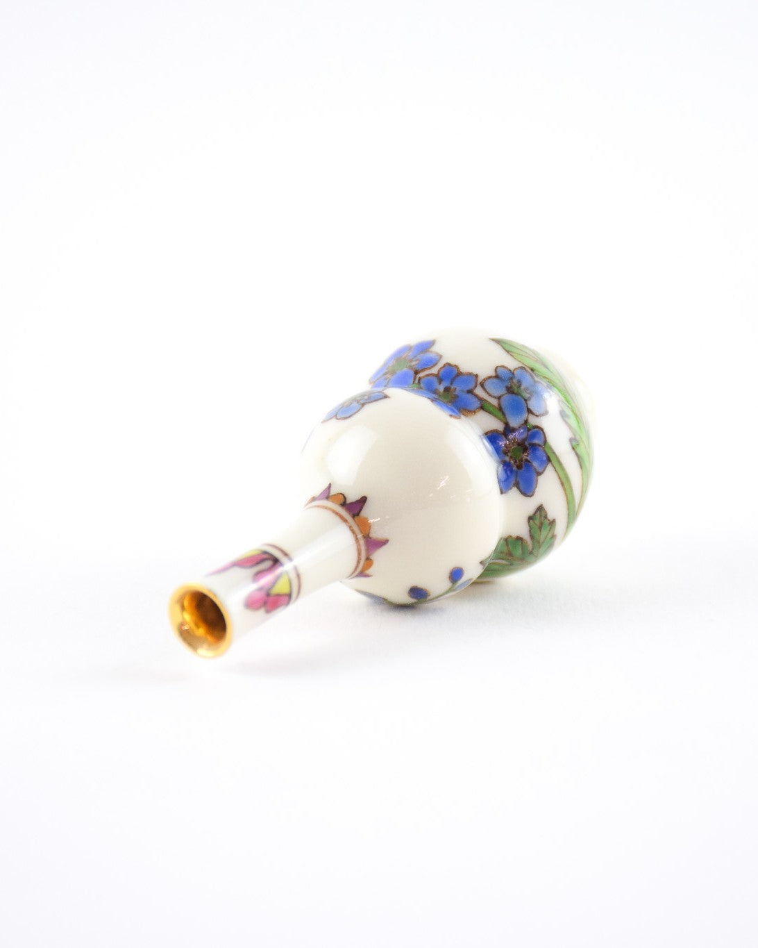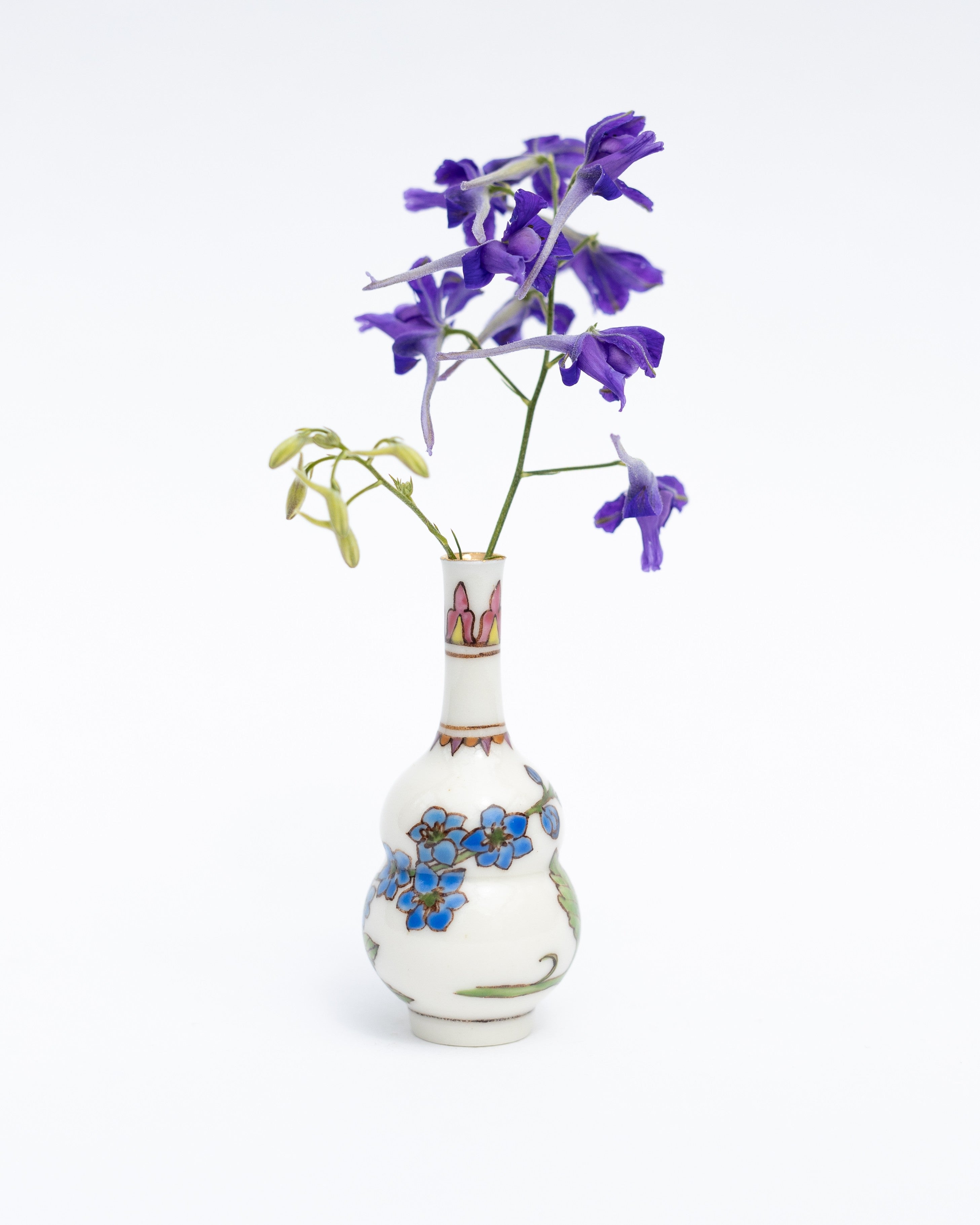 A delicate hand-thrown porcelain vase by Japanese ceramicist Yuta Segawa, individually hand-painted with summer floral motifs by Miyu Kurihara. Finished with a soft gold-coloured glaze at the neck, each piece is entirely unique.