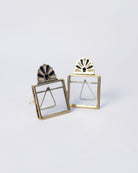 This beautifully handmade standing frame features glass on both sides, ideal for displaying photographs, pressed flowers, or special keepsakes. The black fan-shaped detail at the top adds a decorative flourish, while the brass base provides a simple, elegant stand.