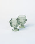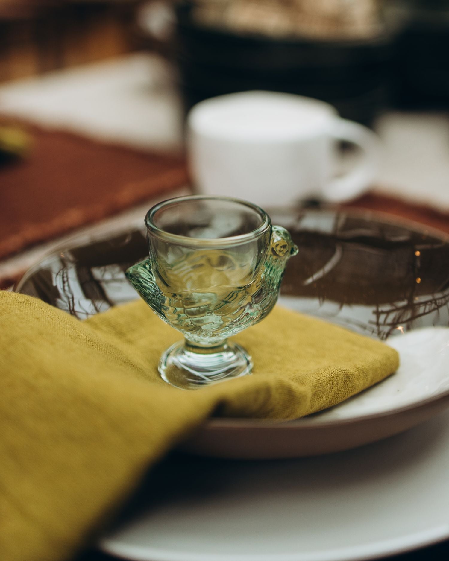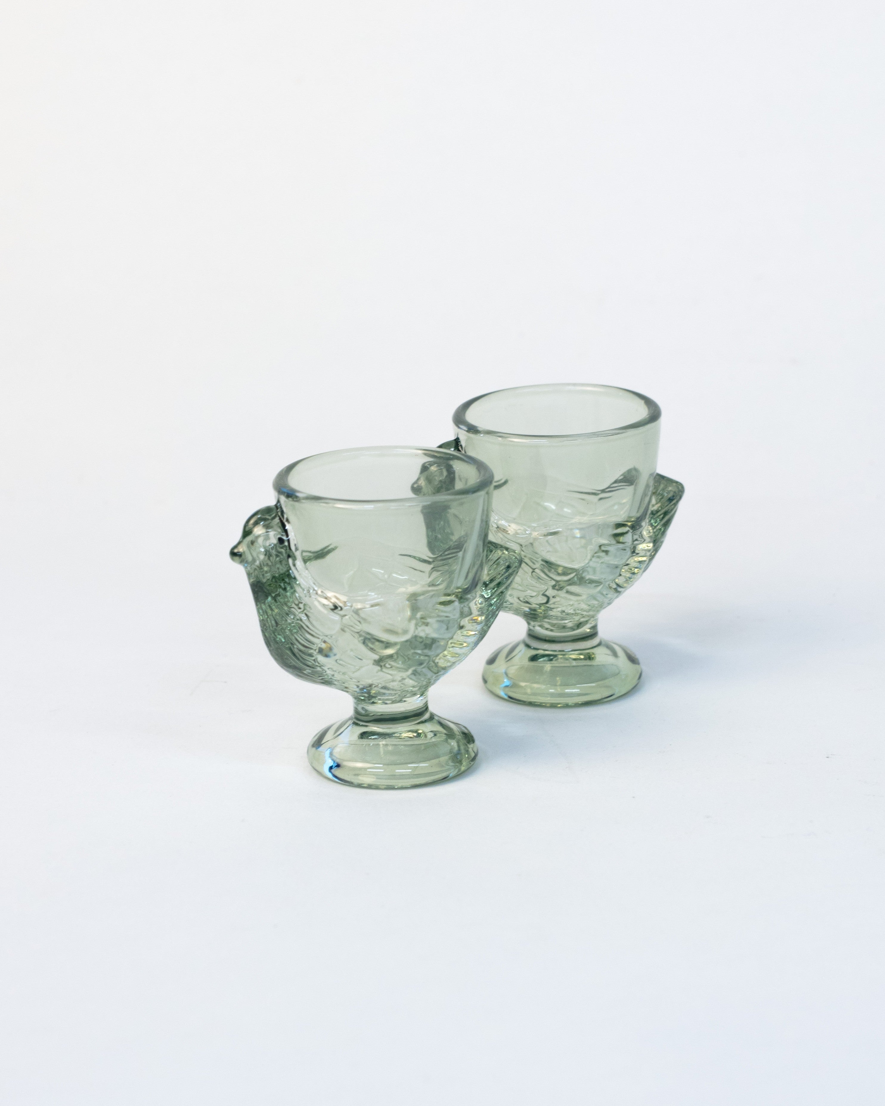 A charming addition to the breakfast table, these glass egg cups feature a delicately moulded chicken design, bringing a light-hearted touch to morning rituals.