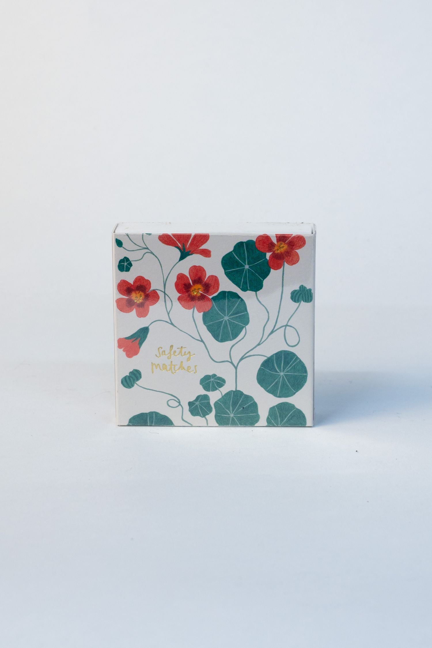 Square matchbox with a tangle of Nasturtiums.