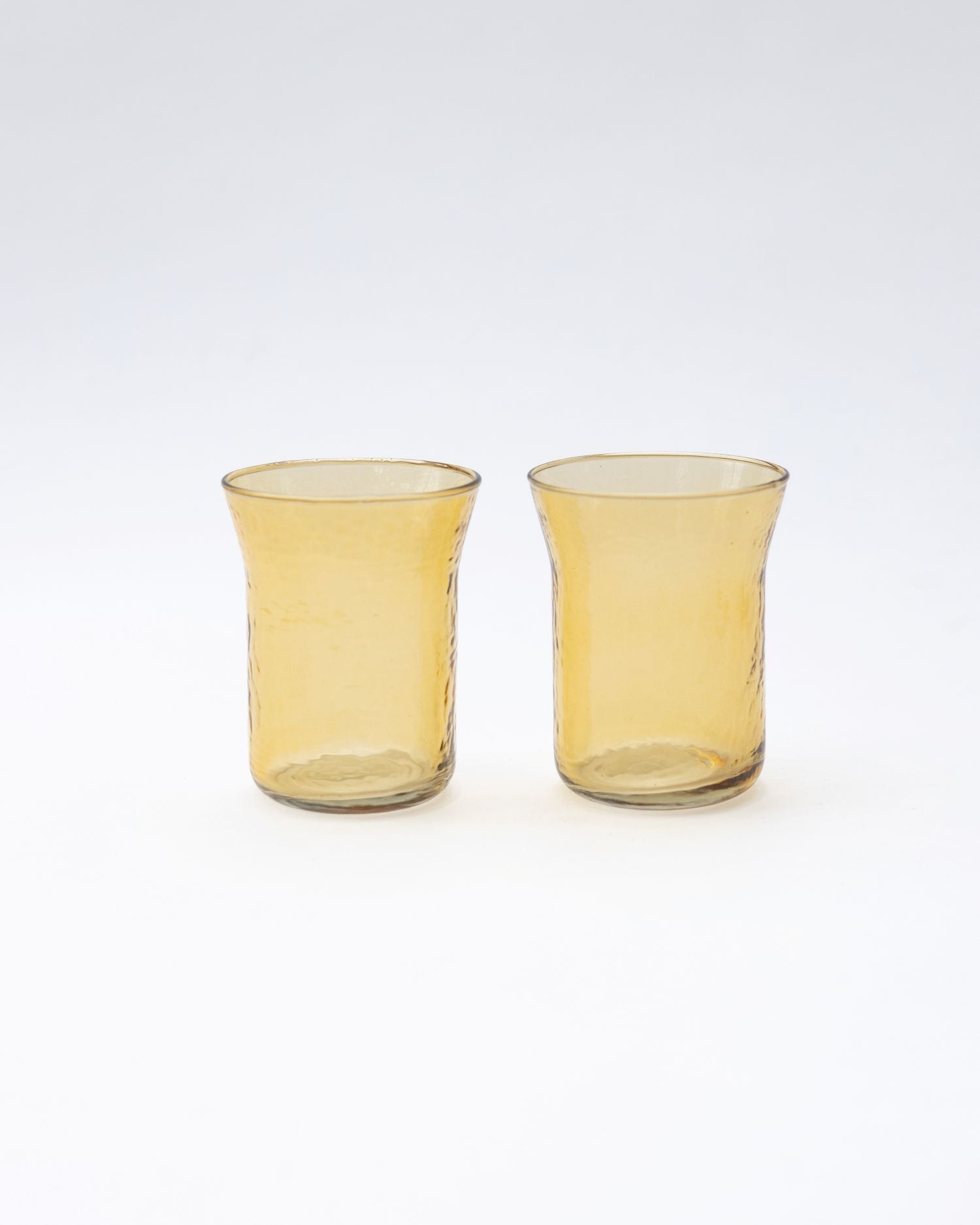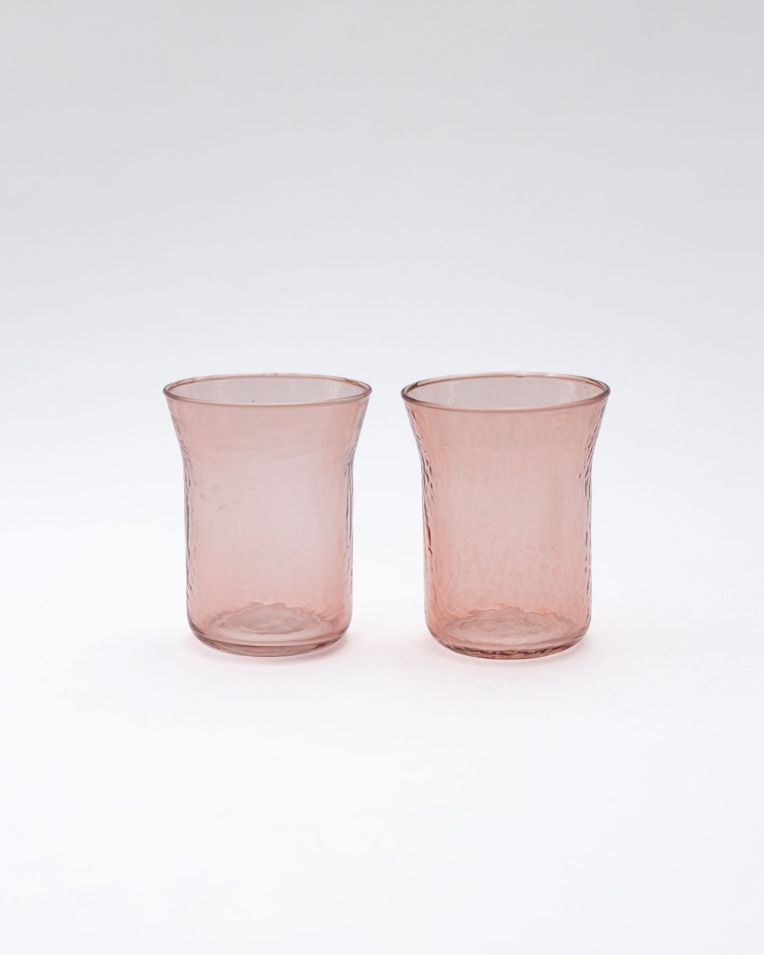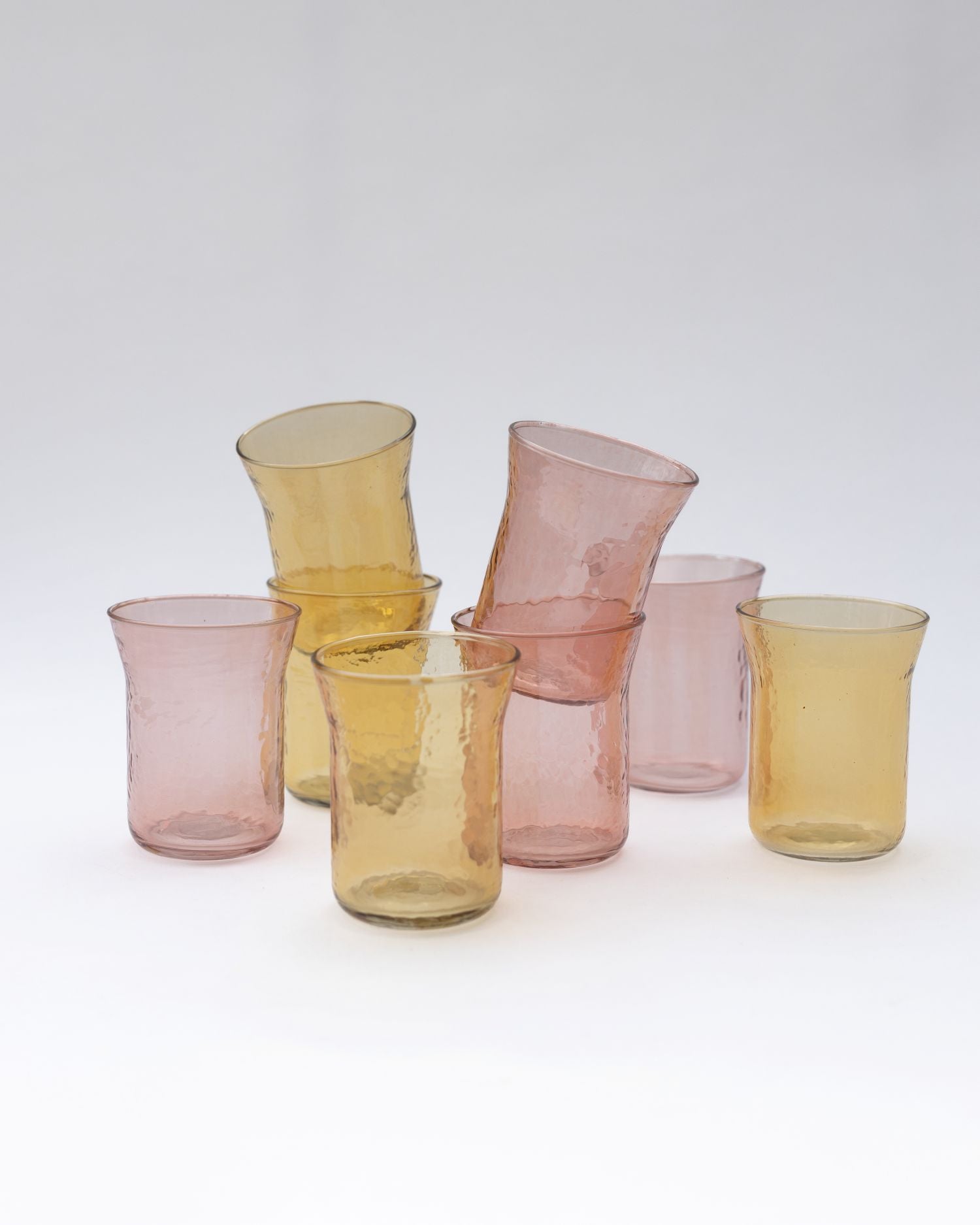 Colourful recycled glass tumblers with a softly hammered finish, available in pink or yellow. Their gentle texture catches the light, adding a subtle variation to the surface while keeping a relaxed, informal feel.
