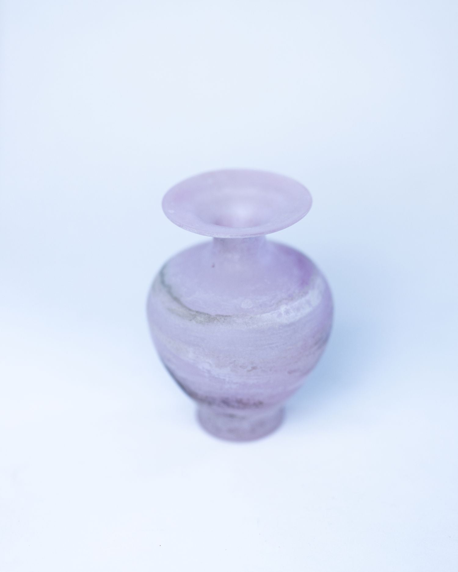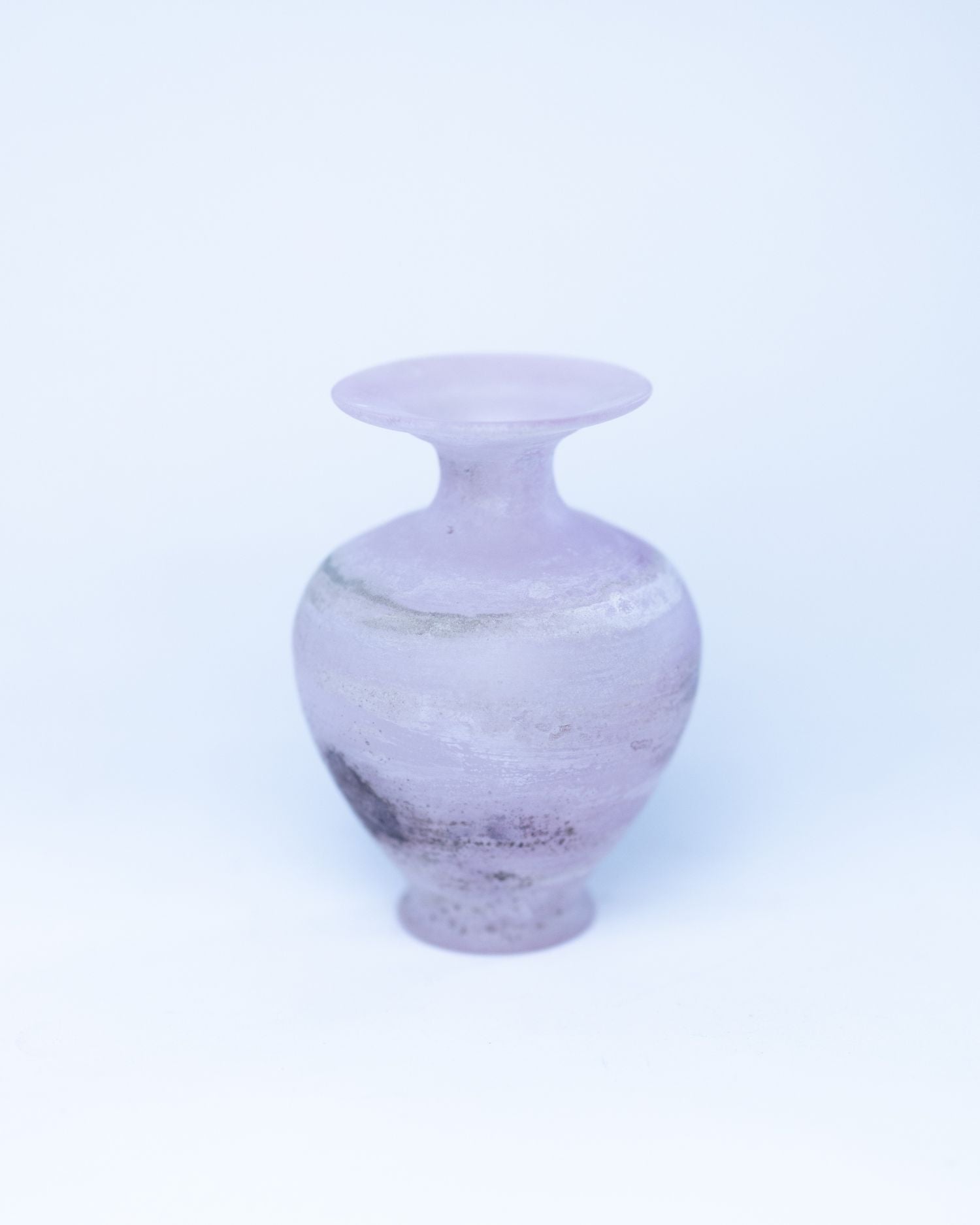 This small Murano vase features a classic amphora-style silhouette, with a rounded body, narrow neck, and wide flared lip. Made using the traditional scavo technique, it has a softly weathered surface in delicate pink tones, with darker markings adding depth and individuality.