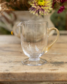 An exquisite vintage Murano jug, hand-blown in clear glass with a sculptural gold-glass handle and wide, open form. The gently flared body rests on a flat, pedestal-style base, elegant in silhouette and generous in scale.